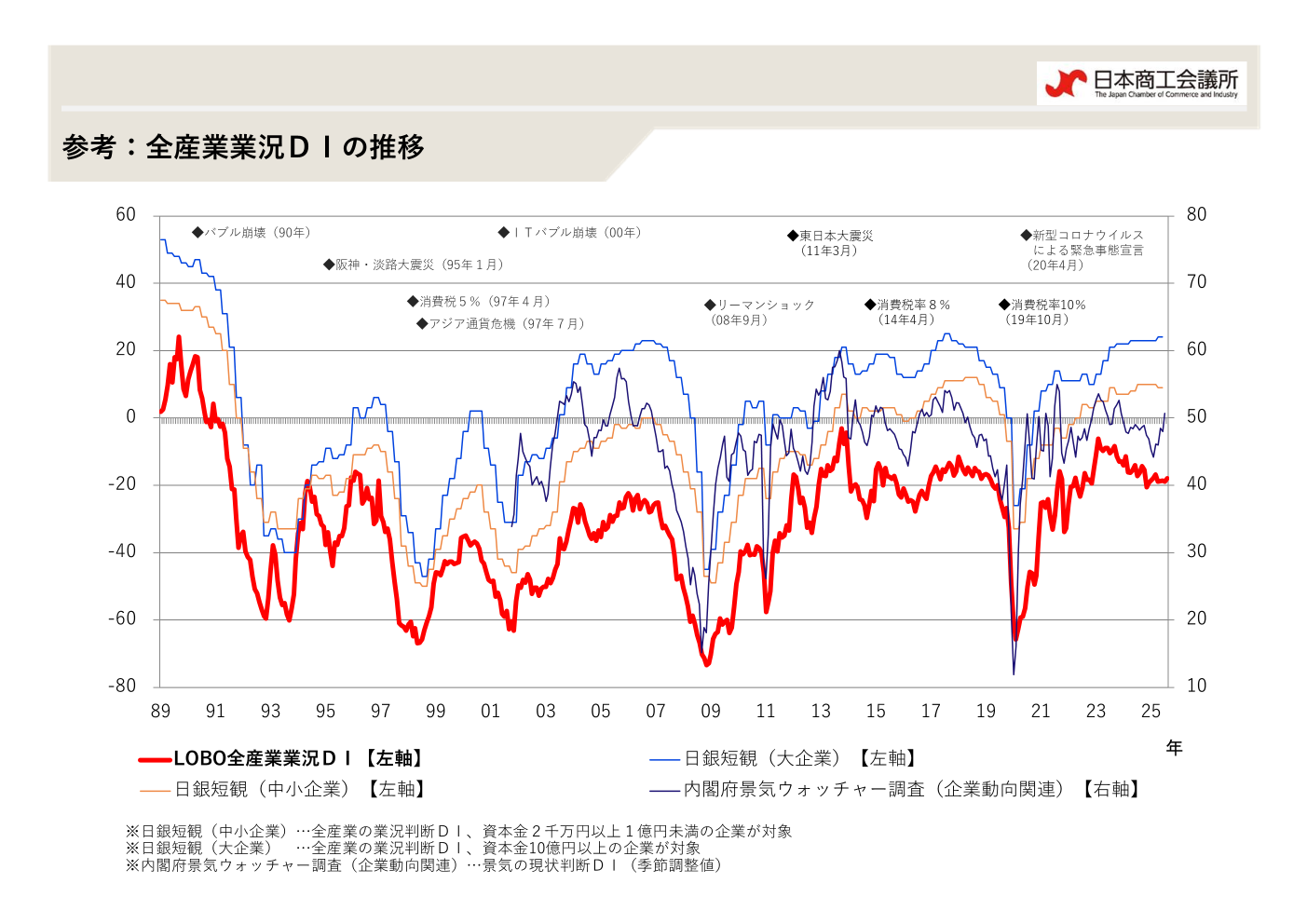 全産業合計の業況DIは、▲18.9(前月比▲2.1ポイント)。建設業・卸売業では、設備投資をはじめとした民間投資が堅調に推移し、改善した。小売業・サービス業では、生活必需品の値上げに伴う消費者の節約志向に、猛暑の影響が重なり、悪化した。また、製造業も食料品関係で小売業・サービス業からの引合いが減少し、悪化した。コメやガソリン価格の上昇に一服感が見られるものの、食料品を中心に生活必需品の値上げは継続しており、節約志向の高まりを指摘する声が聞かれた。また、猛暑の影響が広く聞かれており、熱中症対策品の特需があったものの、外出控えに伴う客数減少から、中小企業の業況は悪化した。