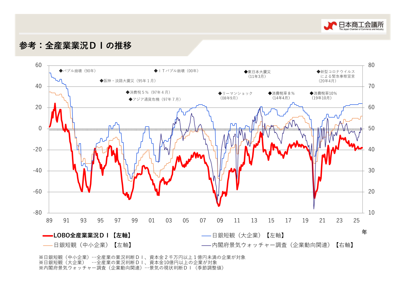全産業合計の業況DIは、▲18.6(前月比+0.2ポイント)。製造業では、残暑による外出控えの継続に伴い食料品関係の引き合いが減少しているほか、秋物衣料の売れ行きが不調なことで繊維製品関係が振るわず、悪化した。一方、建設業では、設備投資需要が底堅く推移しており、改善した。また、小売業も一部の百貨店・総合スーパーでイベント効果などがみられ、改善した。卸売業は小売業からの引き合いを受けて改善した。高い水準での賃上げや米国関税交渉の合意に伴い、消費マインドはわずかながら上向きつつある。一方、残暑による外出控えの影響が継続し、業況はほぼ横ばいとなった。